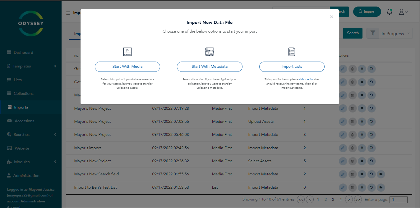 To start a new import, click the Start New Import button. You have three choices when a pop-up window appears: Import Lists, Start with Media, and Start with Metadata